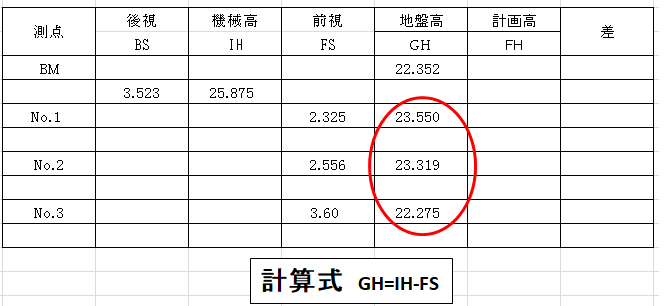 測った測点(No.1 No.2 No.3)の標高を計算します。見ていたところ(IH)より測ったところがそれぞれ低いです。
